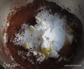 Песочное шоколадное тесто: В чаше миксера соединить муку, какао, нарезанное кубиками сливочное масло, сахар, яйцо и замесить тесто.