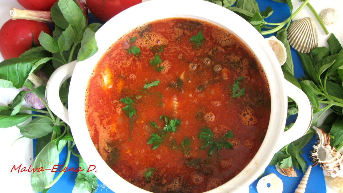 В похлебку кладутся различные морепродукты: креветки, гребешки, небольшие кальмары, мидии. Томаты, вино, специи и зелень придают похлебке яркий вкус. Если хотите получить более насыщенный рыбный бульон – возьмите более крупную рыбу, у меня это две небольшие радужные форели, из которых получился нежный бульон.