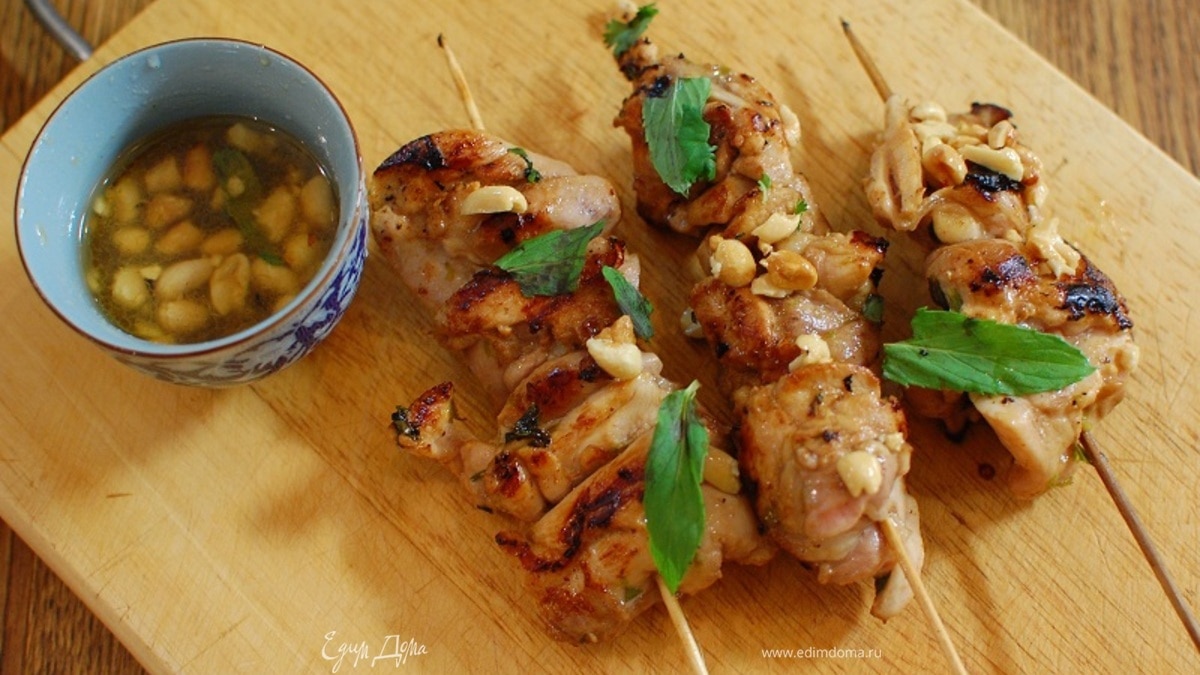 Куриное мясо можно мариновать при комнатной температуре около трех часов, а еще лучше оставить на ночь в холодильнике. Для этого блюда понадобятся деревянные шпажки, их нужно заранее замочить в воде, чтобы не сгорели.