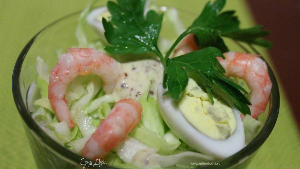 Выкладываем салат слоями, капуста, одно яйцо порезанное на четвертинки, не много заправки, затем очищенные креветки 7 шт, далее опять капуста, заправка, болгарский перец, огурцы, зеленый лук, заправка, и последний слой капуста. Украшаем креветками, яйцом, заправкой и веточкой петрушки. Приятного аппетита!