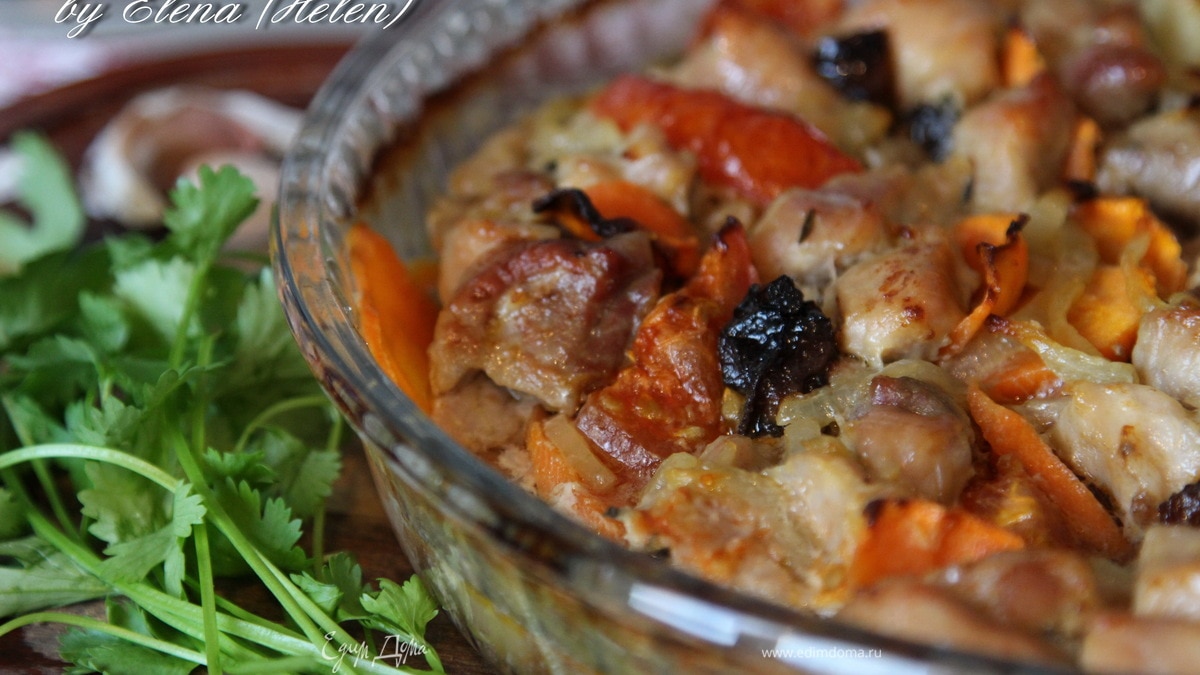 Свинина, запеченная с овощами и черносливом