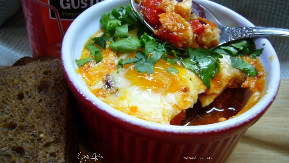 Керамические формочки смазать оливковым маслом, выложить томатно-фасолевый соус, сверху разбить яйцо, посыпать тертым сыром. Отправить в духовку, разогретую до 200 град. на 12 мин. - Шаг 7