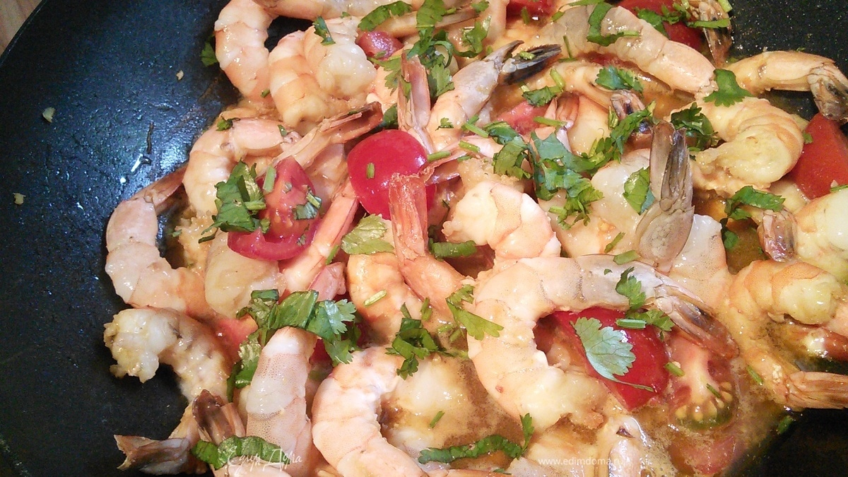 Рецепт от Юлии Высоцкой. В то время я только открыла для себя передачу " Едим дома!" и, посмотрев очередную, бежала вприпрыжку ( другое слово подобрать сложно, потому, как Юлия заряжает своей энергией и искусством куховарить и вызывает бешеное желание бежать на кухню и готовить по её рецептам)!! С тех пор готовлю креветки по её рецепту, рекомендовала его своим друзьям, всегда очень вкусно, срочно и ароматно. Пусть всегда будет вкусно !