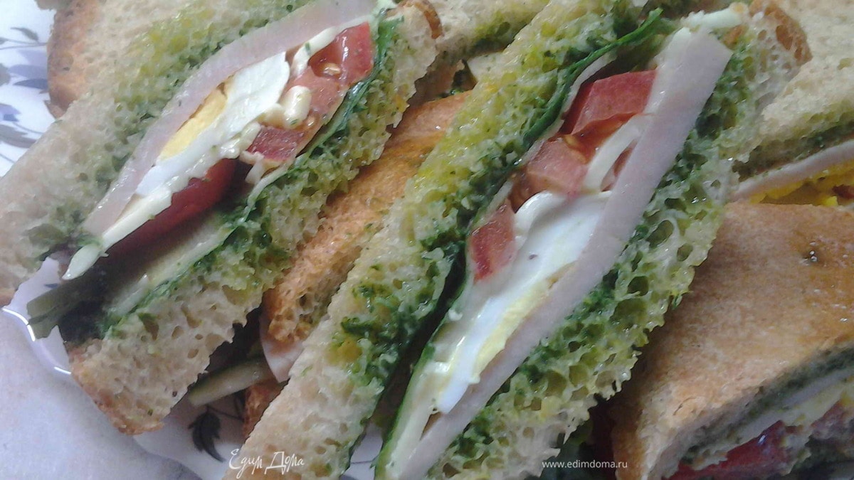 Оставшиеся два куска хлеба тоже смазать зеленым маслом с одной стороны и накрыть сандвич. Обматать сандвичи пищевой пленкой и положить под груз минут на 15. Развернуть сандвичи и разрезать по диагонали. Угощайтесь, приятного аппетита.