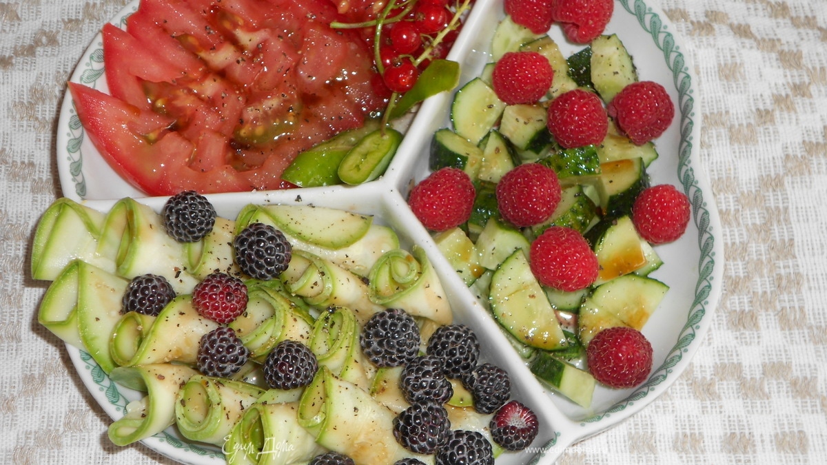 Помыла, порезала овощи, красиво разложила на тарелке. Посолила, поперчила, добавила оливковое масло и гранатовый соус. Теперь очередь за ягодами. Получилось очень аппетитно! Угощайтесь, всем хватит!