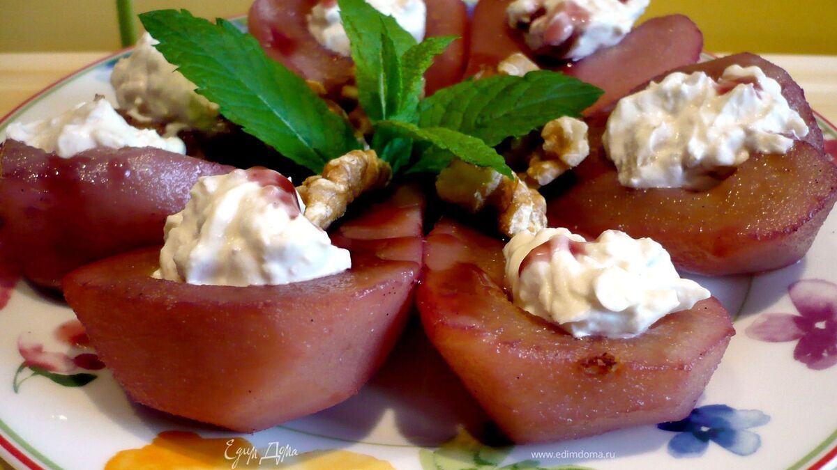 Десерт "Груша в вине, фаршированная грецким орехом и маскарпоне"