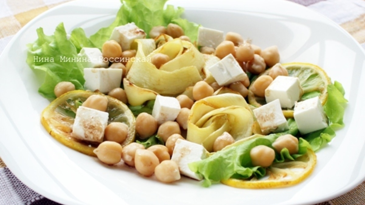 Нут замочите в воде на ночь, а затем сварите, например, в мультиварке на режиме "бобы" в двух стаканах воды. Кабачок с кожурой, если она нежная и лимон с кожурой нарежьте тонкими ломтиками. - Шаг 1Обжарьте кабачок на оливковом масле до мягкости и затем кружочки лимона - до небольшого зарумянивания. Соедините готовый и остывший нут, листья салата, кабачки и лимоны. Посолите слегка. Полейте заправкой из оливкового масла, взбитого с бальзамиком и лимонным соком по вкусу и посыпьте салат при подаче кусочками феты. Приятного аппетита!