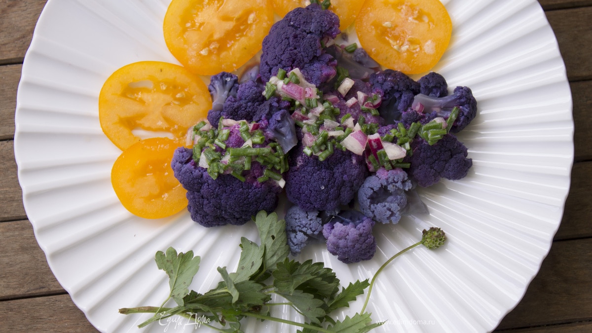 Фиолетовый салат из цветной капусты с желтыми помидорами