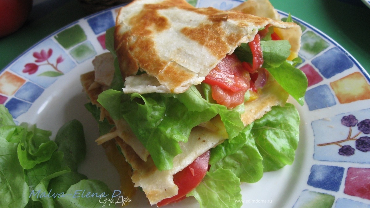 Дать курице немного остыть, нарезать пластинами, распределить кусочки курицы между двумя тортильями, положив на половинки лепешек.