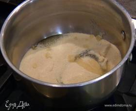 Растопить 150 г сливочного масла, добавить сахар и мед и держать на маленьком огне, пока не растворится сахар (ни в коем случае не кипятить!).