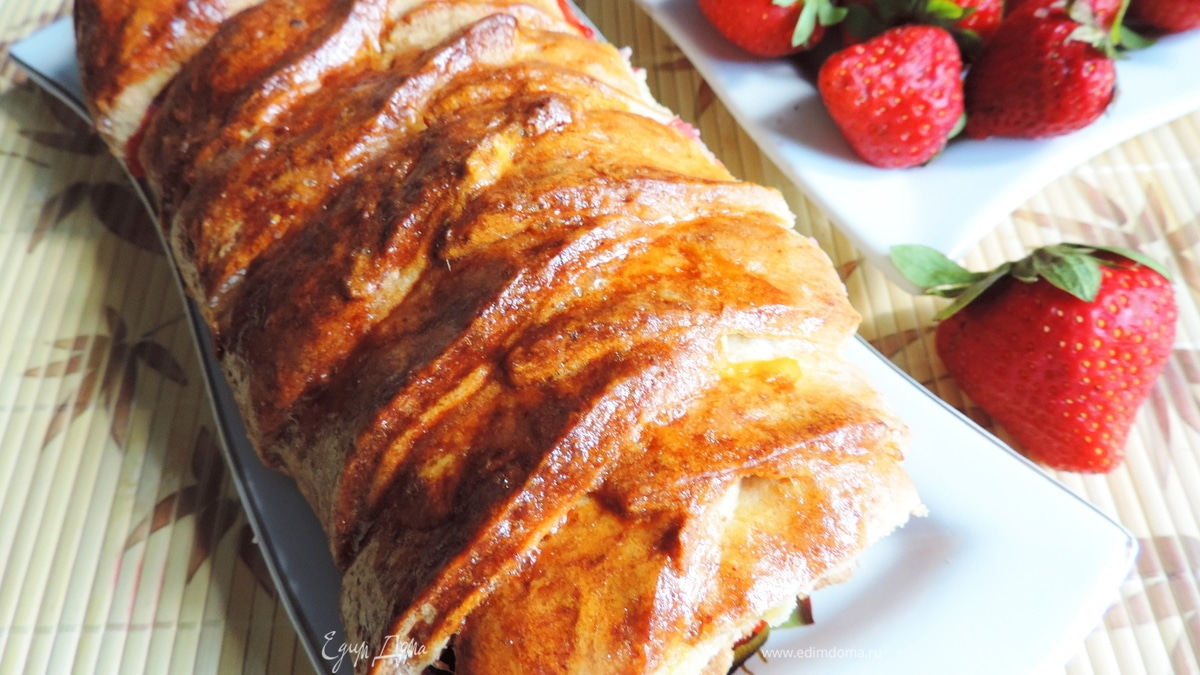 Я представляю вашему вниманию клубничную плетенку из песочно-дрожжевого теста. Оно напоминате традиционное песочное, но менее сухое и не так сильно крошится. Поэтому готовое изделие отлично нарезается и держит форму. Так что кусочки пирога будут не только вкусными, но и аккуратными.