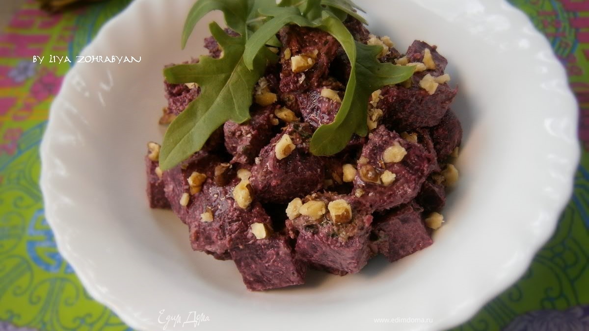 Салат из запеченной свеклы с песто из руколы и грецких орехов