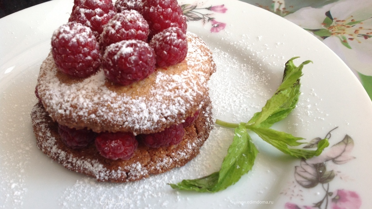 Этот рецепт долго ждал своей участи. Я его увидела в одном журнале несколько лет назад, вырезала рецепт, положила как закладку в книгу и забыла... а тут недавно нашла. По сути это миндальное печенье с малиной, хрустящее... и мягкое внутри, очень вкусно. Муж попросил отдельно печенье и ел вприкуску с малинкой, а сыночек попросил дополнить взбитыми сливками, но главное всем очень понравилось.