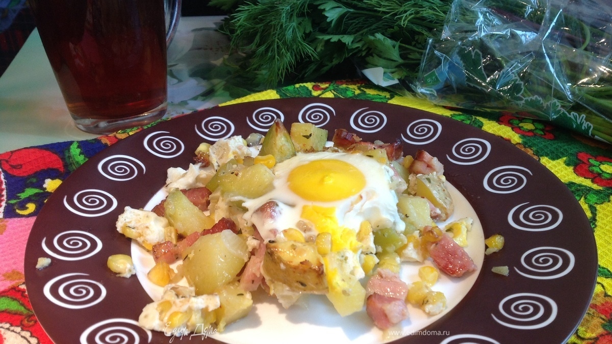 Яичница и запеченный картофель с беконом и ароматными травами