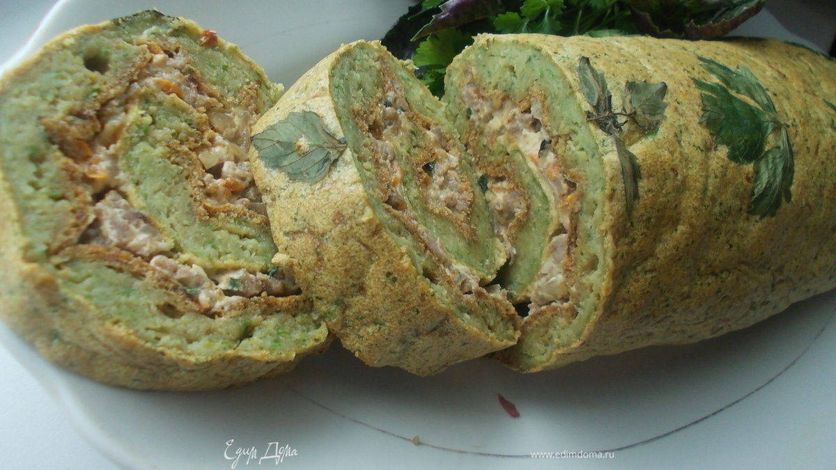 Рулет из кабачкового теста с начинкой из овощей, мяса и сыра