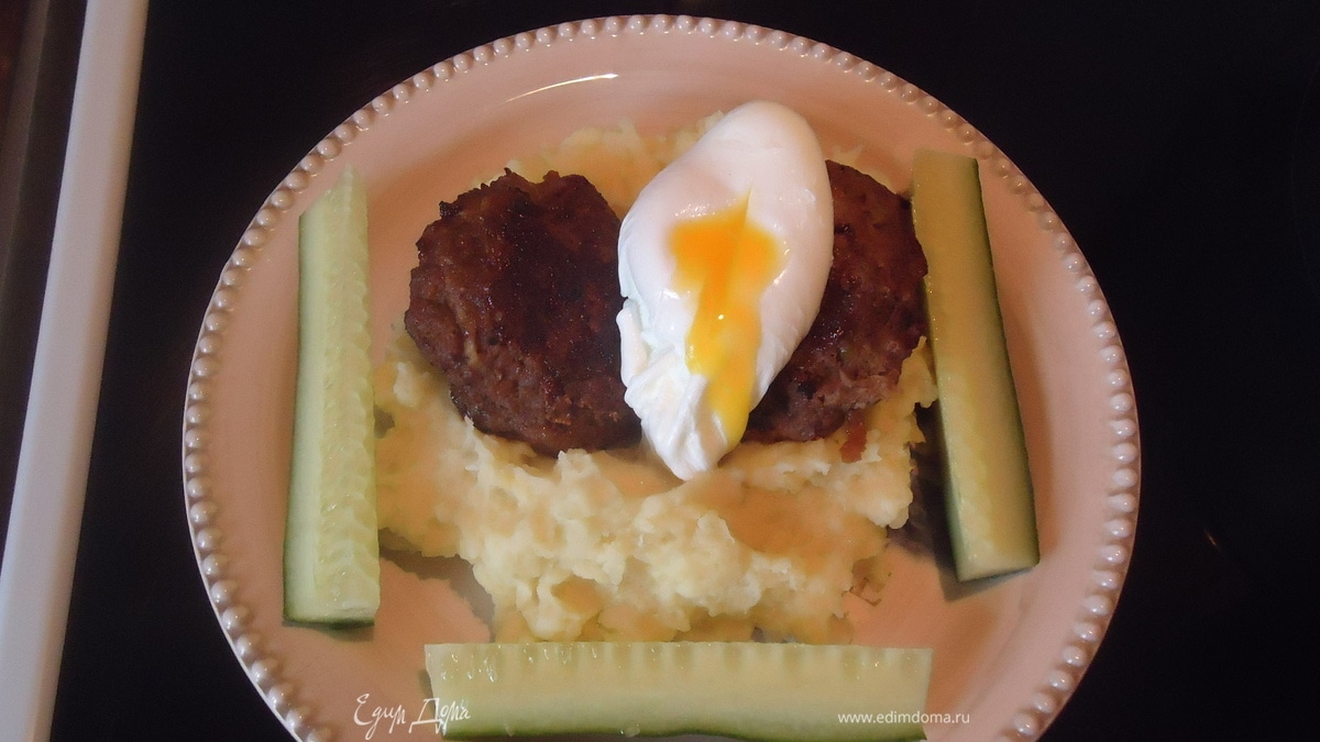- Шаг 3Собираем блюдо: Пюре выкладываем на тарелку, посередине делаем углубление, кладем пару котлет, а сверху яйцо-пашот. Огурец режем на длинные брусочки, кладем на тарелку яйцо-пашот, надрезаем.