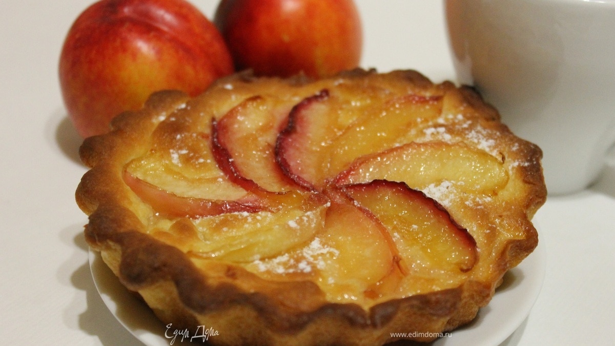 Формочки смазываем сливочным маслом. Раскатываем кусочек теста нужного диаметра, кладем в формочку, пальчиками распределяем по дну и краям. Сверху выкладываем нектарины. - Шаг 6