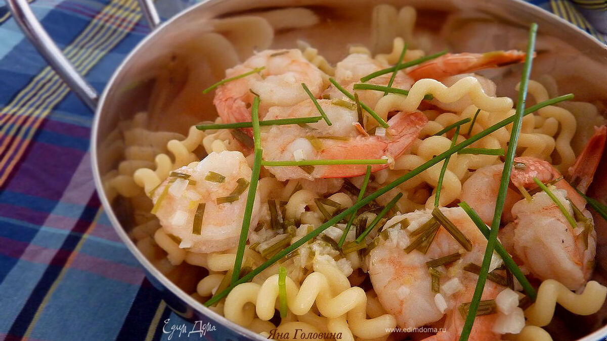 Перемешать пасту и креветки , посыпать луком . - Шаг 5