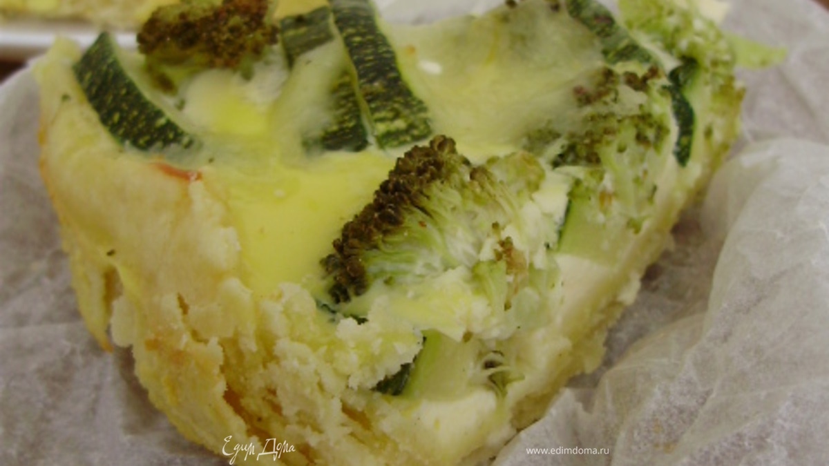 На корж по кругу выложить, чередуя, цукини и брокколи. Залить яично-молочной массой и выпекать 40 мин при 180 С