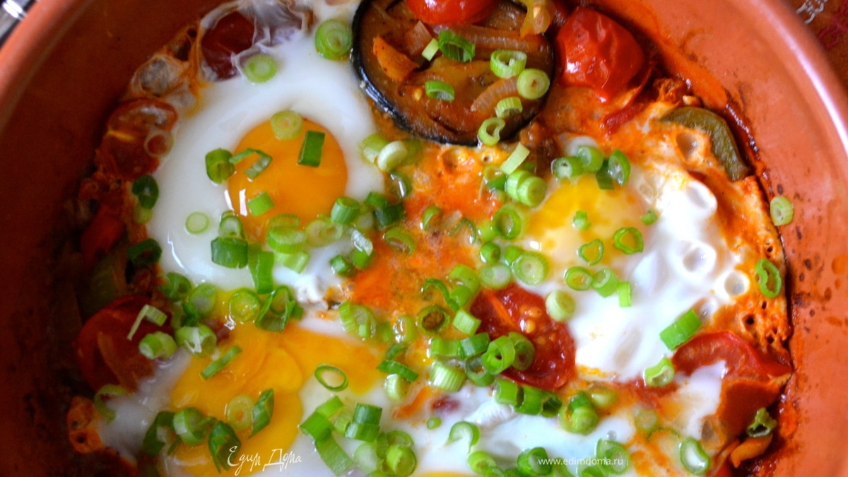 В общем, хочу вам предложить наш семейный варинт этого блюда. Найденные мною в интернете рецепты этой яичницы обычно подразумевают использование лука и помидоров..., иногда болгарского перца! Но, в моей любимой яичнице обязательно были баклажаны ("синенькие" )! Количество ингредиентов привожу ориентировочное.... Все зависит от того, сколько человек Вы хотите угостить Вашей яичницей!!! Рецепт не нов. Но если Вы еще не пробовали такую яичницу, советую Вам ее приготовить! При всей простоте рецепта, результат Вас порадует! Очень вкусная, СОЧНАЯ, аппетитная яичница с ароматным соусом, который Вам захочется подобрать свежим хлебушком...