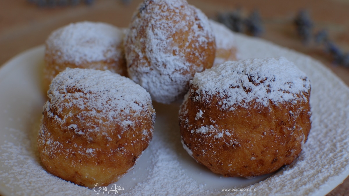 Готовые пончики выкладывать на бумажное полотенце, чтобы убрать излишки жира, затем переложить на блюдо и посыпать сахарной пудрой.