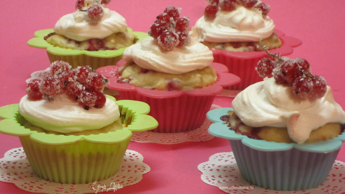 Маффины вынуть из духовки, отсадить белковый крем. Выпекать еще 10 минут. Для украшения 50 грамм смородины с веточками вымыть, окунуть в 40 грамм сахара, выложить на безе.