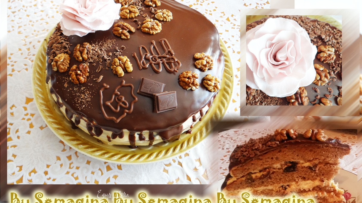 - Шаг 3ГЛАЗУРЬ Сливки подогреть (100 г), добавить шоколад, растворить, добавить сливочное масло, перемешать. Полить торт глазурью, поставить на ночь в холодильник. Украсить орехами, шоколадной стружкой, мастичной розой.