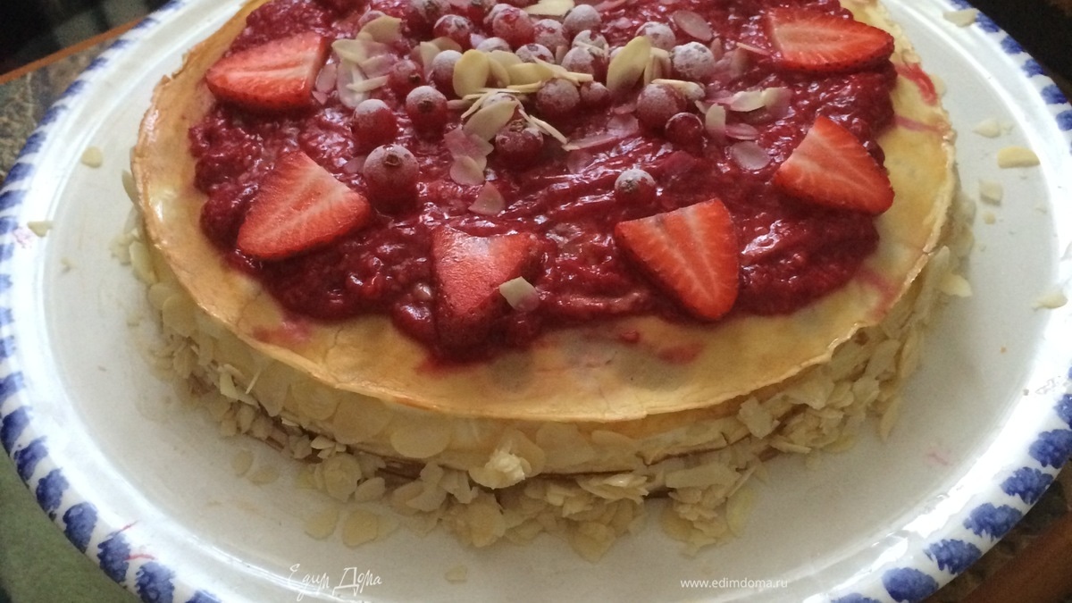 На блюдо, подходящее по диаметру, выложить блин. Смазать его кремом (примерно 1,5-2 ст.л. крема на блин), накрыть вторым блином. Так собирать торт, пока не закончится крем или блины. Завершающий блин ничем накрывать не надо. Убрать торт в холодильник на ночь.