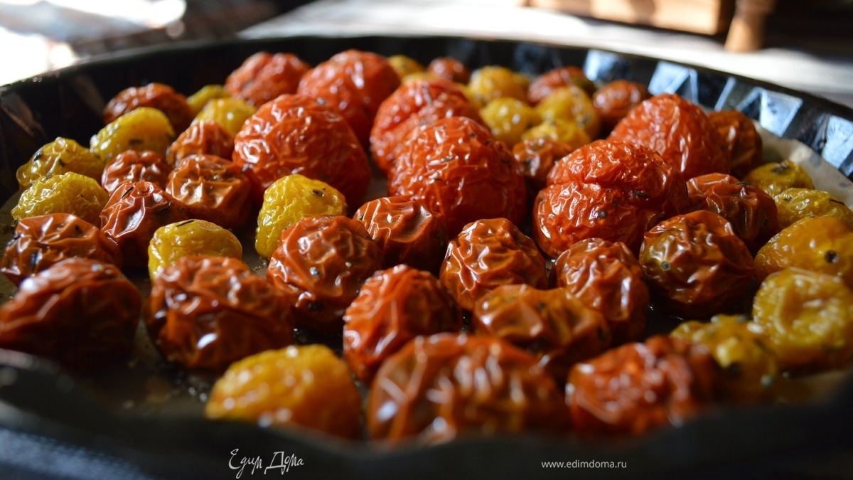 Духовку разогреваем где то до 160 градусов. На противень выкладываем целые помидорчики, сбрызгиваем оливковым маслом, приправляем перцем, солью, присыпаем листиками тимьяна ( можно и целые веточки покидать), тоже с розмарином , чеснок не чистим- просто давим зубчики ножом и эти ароматные бомбочки кидаем к томатам:). Пару часов томим в духовке при 160 (можно на конвекции создать эффект сицилийского солнца с проветриванием 😎), затем убавляем до 100-110 и на ночь (6-8часов). Та-даам ! - Шаг 1