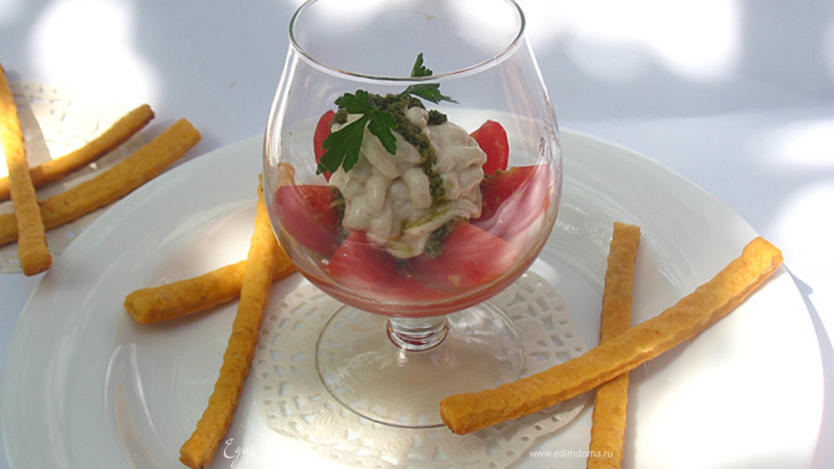 Эта закуска имеет тонкий вкус, с множеством послевкусий, а акцентом являются хрустящие пармезановые палочки.