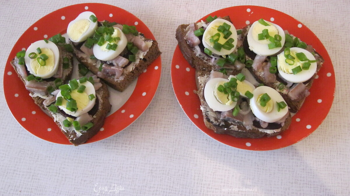 Поверх рыбки на наши бутерброды выкладываем порезанные на кругляшки яйца.