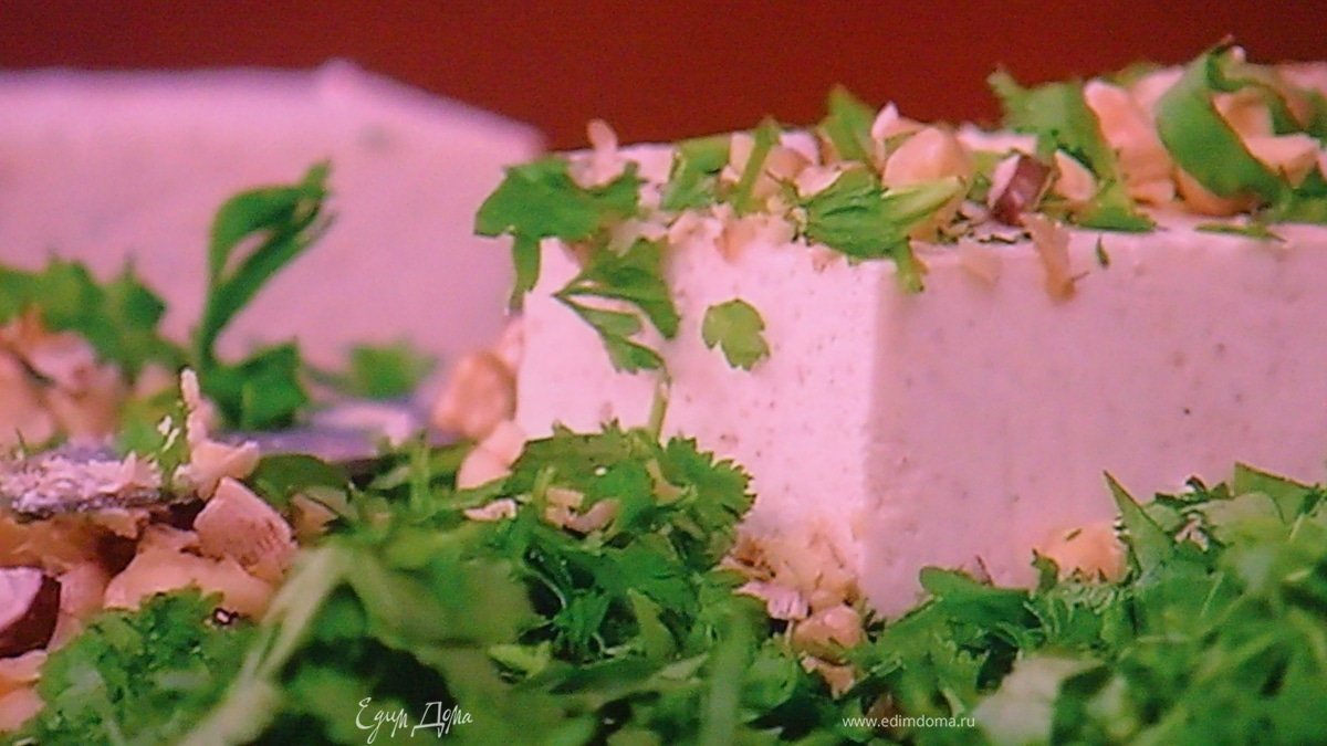 Террин нарежьте на порционные кусочки, не слишком мелко, обваляйте его в орехово/травяной смеси: щедро и подавайте, к примеру с поджаренными на оливковом масле гренками из ржаного хлеба. Бокальчик белого охлаждённого сухого вина идеально подойдёт к сырной закуске! - Шаг 7