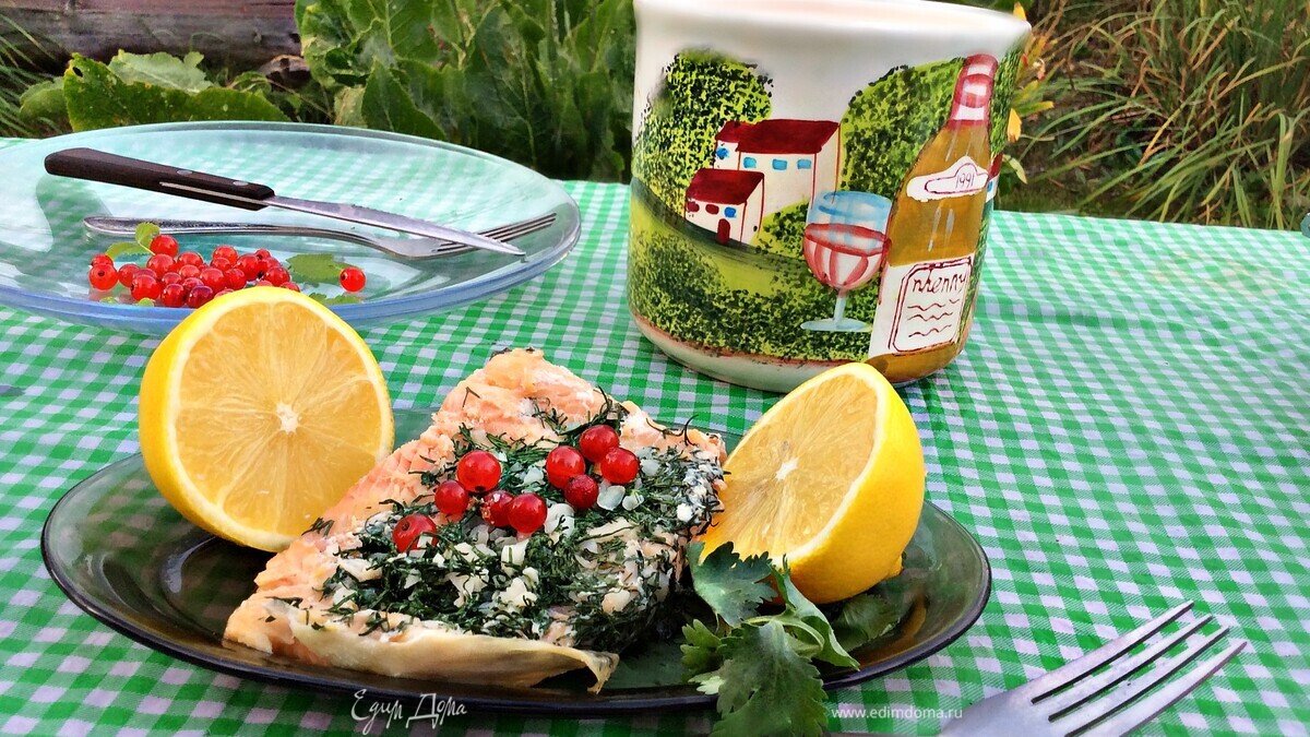 После запекания дать рыбе 5 мин "отдохнуть" в фольге, затем аккуратно развернуть и подавать к столу обильно сбрызнув лимонным соком. Приятного вам аппетита и вкусного пикника!!