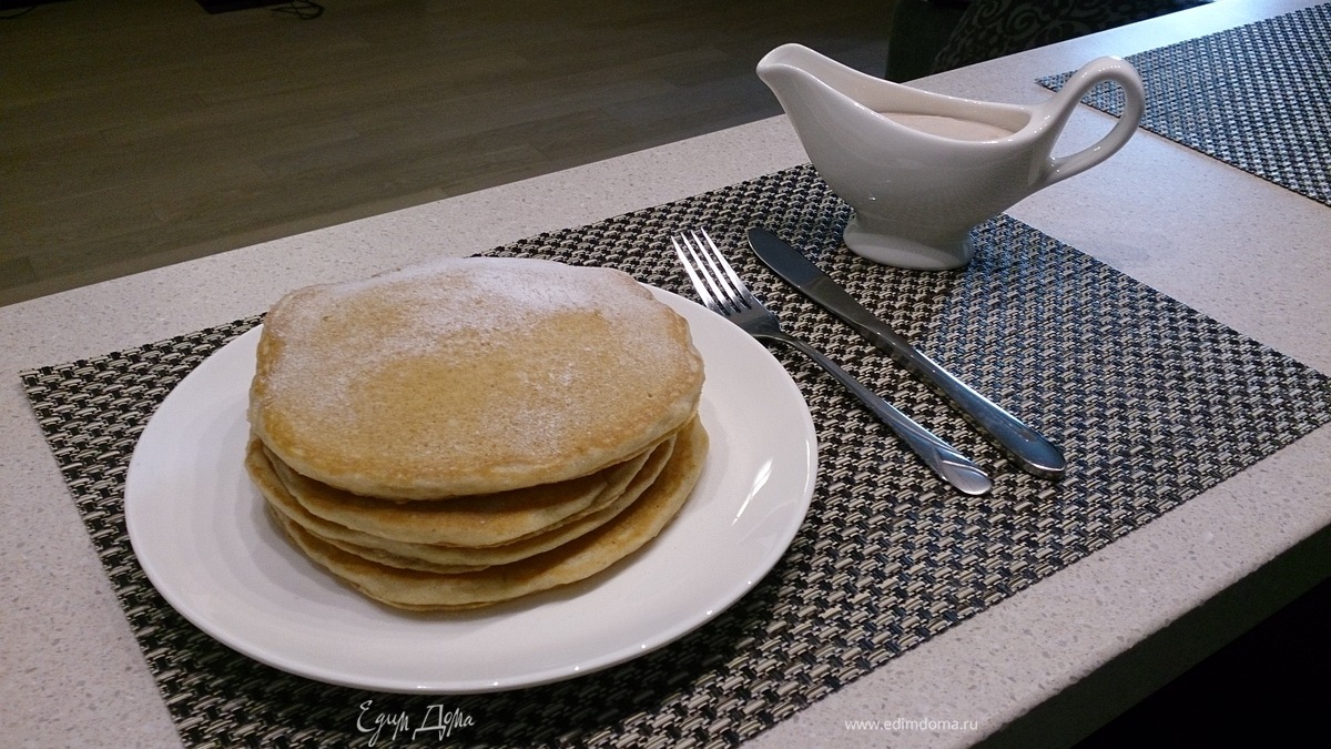 Классический вариант подачи pancakes: положить 2-3 горкой, промазывая маслом, и полить кленовым сиропом. Я просто присыпала сахарной пудрой и сделала соус из сливок и черничного сиропа . Приятного аппетита!