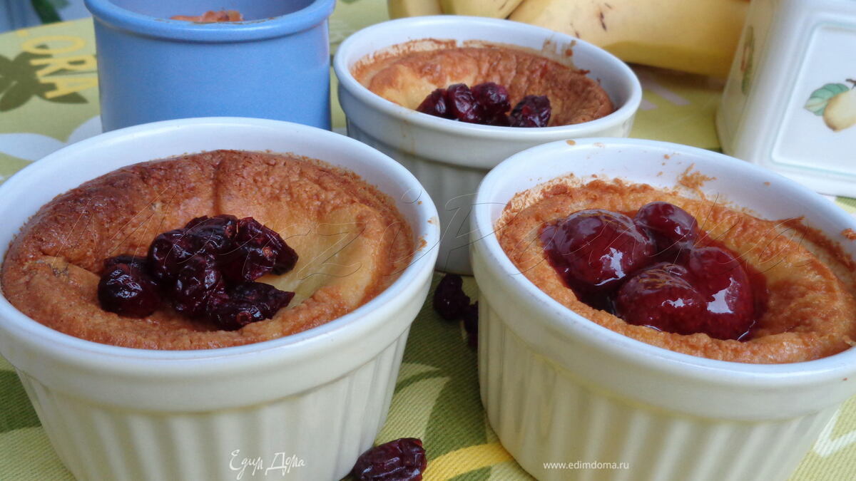Запечь пудинг в духовке при температуре 175° С примерно 45 минут. Подавать со свежими ягодами, сухофруктами или вареньем. Я использовала домашнее клубничное варенье и сушеную клюкву для подачи. Нежная структура пудинга понравится всем!
