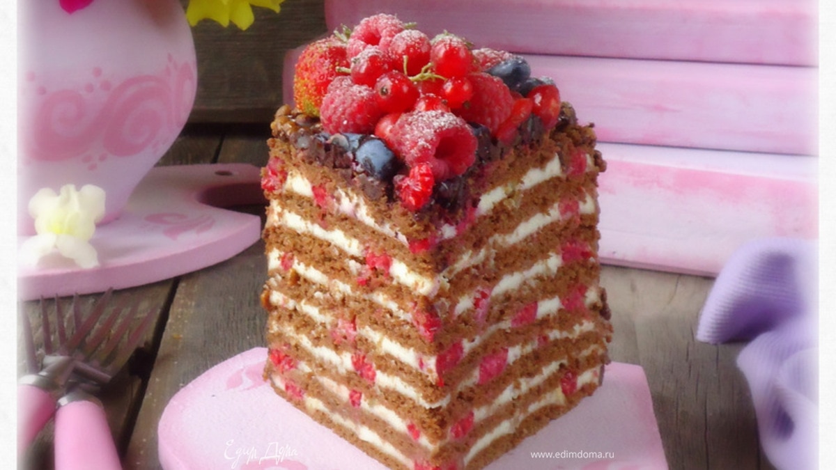 Бока торта обмазать кремом и обсыпать грецким орехом в карамели. Сверху уложить ягодное ассорти. - Шаг 19