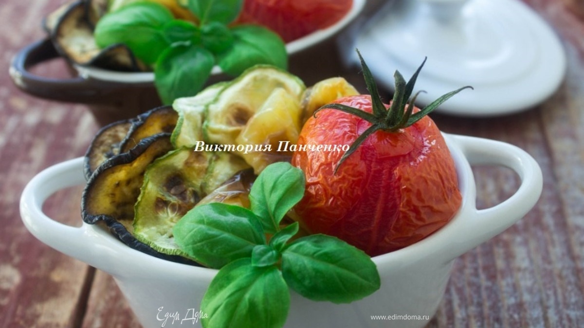 Готовые овощи разложить по порционным кокотницам или салатникам, украсить листикам базилика.