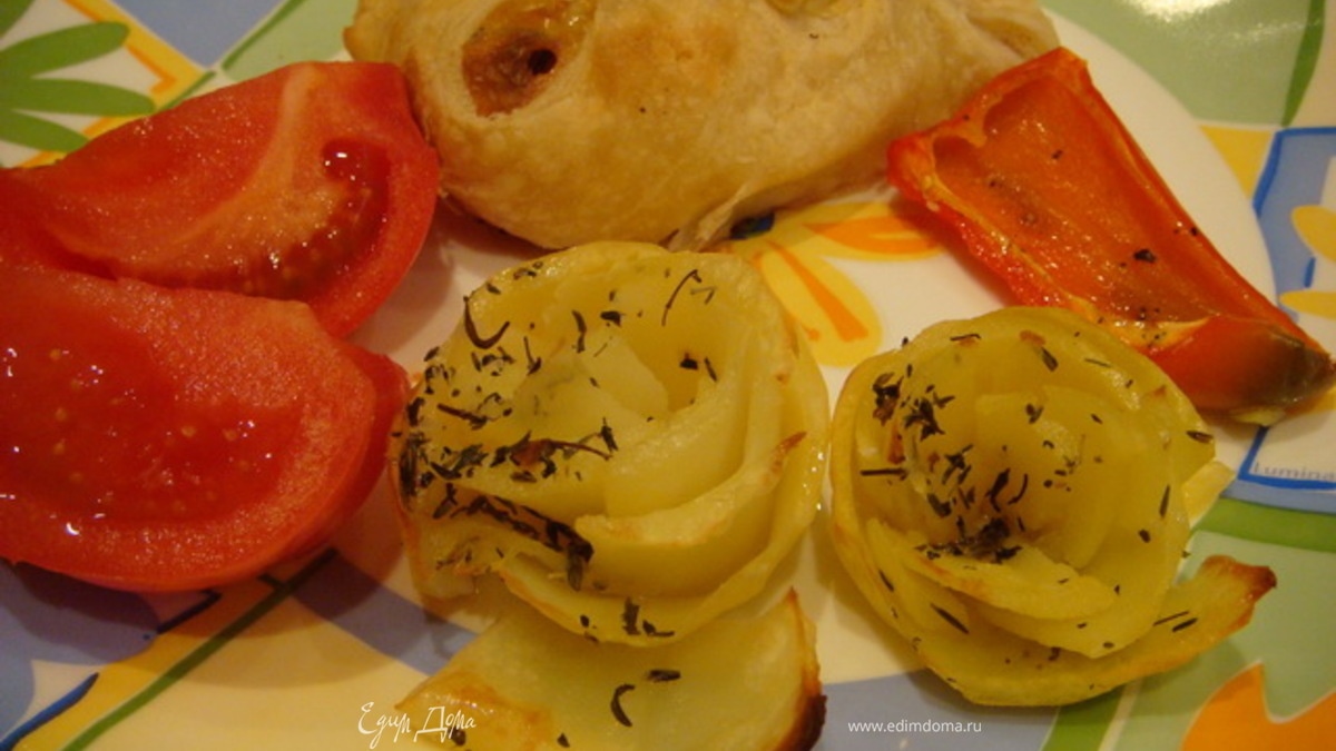 Курочка в слоеном тесте с картофельными розами