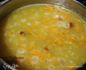 Копченые куриные крылышки в количестве 3 шт. разрезать по суставам и положить в кастрюлю. Туда же добавляем обжаренные овощи и варим 10 минут.