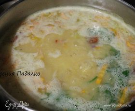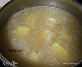 Когда горох будет почти готов, добавить в кастрюлю картофель. Варить до готовности картофеля. Потом содержимое кастрюли потолочь толкушкой для пюре.