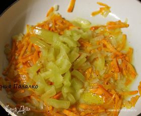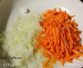 Морковь нарезать соломкой, лук мелкими кубиками, обжарить на масле до слегка золотистого цвета.