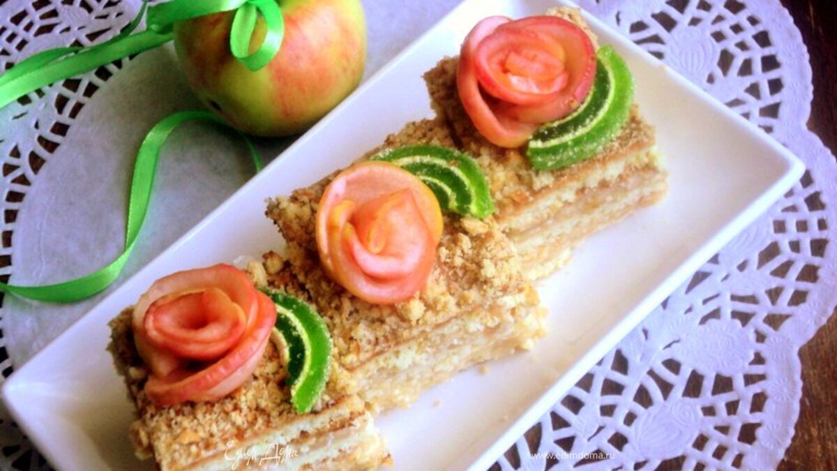 Пляцок разрезать на кусочки, украсить розочками из яблок, листики из мармелада. - Шаг 8