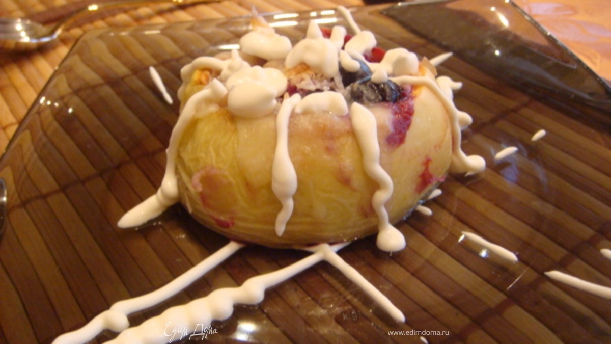 В очищенные яблоки внутрь посыпать сахаром 1 ч.л. и корицей по вкусу,примерно 1/4 ч.л. . Потом распределяем смесь печенья с орехами, примерно по 2 ст.л. . Сверху крем и ягодки смородины. (всегда на кусту оставляю для украшения к блюду и поесть, так остается немного до конца августа). Поставить в разогретую духовку 180 градусов на 15 минут. - Шаг 5