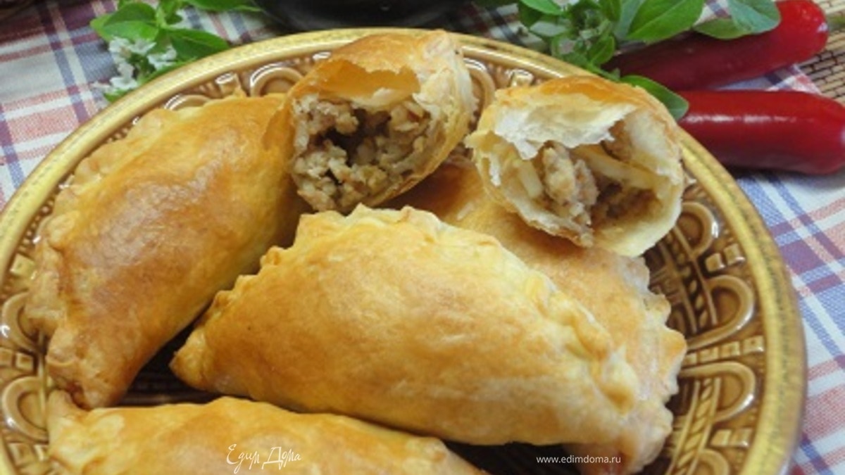 Слоеное тесто тонко раскатать и вырезать кружки диаметром около 12 см. В середину выложить начинку, свернуть пополам и хорошо защипать края. - Шаг 4