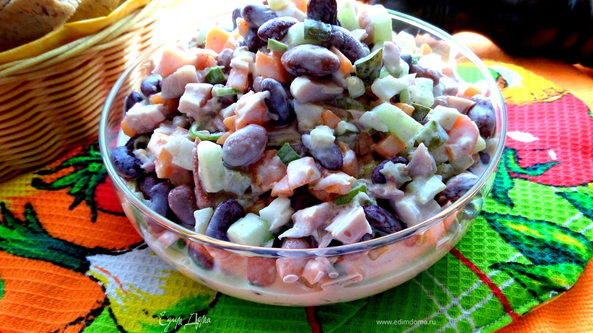 Танюша,готовила салатик в ожидании праздника.Очень вкусный,сытный,для торжества тоже подойдёт.Только у меня красной фасоли не было,поэтому бледноват.Очень порадовал!😃😌😍🌸🌸🌸