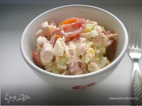 Очень вкусный салат из обычных продуктов,особенно хорош лук порей, придает салату какую то пикантную нотку. Гости уходя сказали,чтобы в следующий раз этого салата побольше было!