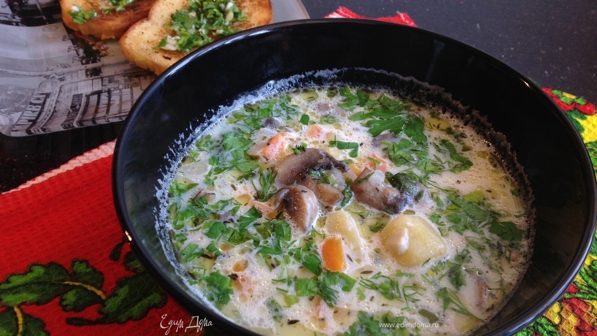 Встретила этот рецепт в журнале, и сразу же вспомнила детство. Мы с дедушкой каждый год ездили в Тамбов к его сестре, и она нам всегда варила такой супчик из лисичек. У нас, конечно, лисичек не найдешь, но и с шампиньонами получается очень вкусно. А вообще, я думаю подойдут любые свежие грибы.