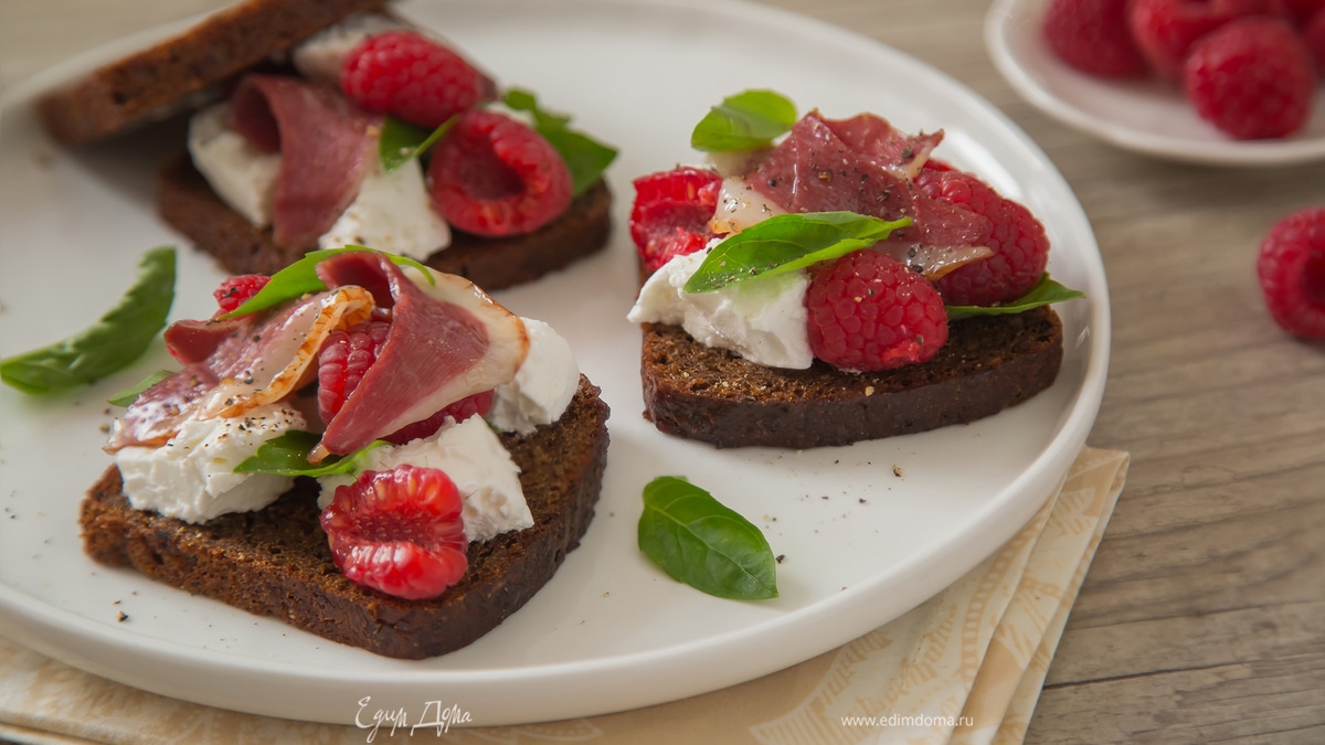 - Шаг 2На ломтики хлеба выложите козий сыр, утку, малину, листики базилика, слегка поперчите.
