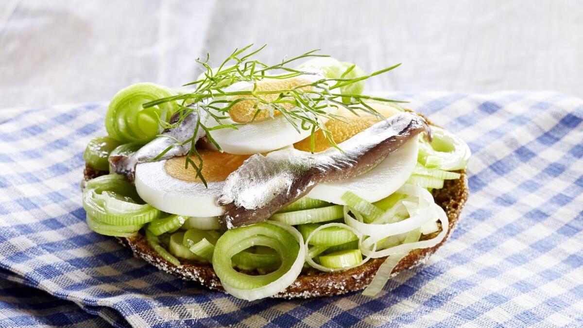 Соберите бутерброд, добавив яйца и анчоусы. Украсьте укропом. Приятного аппетита!