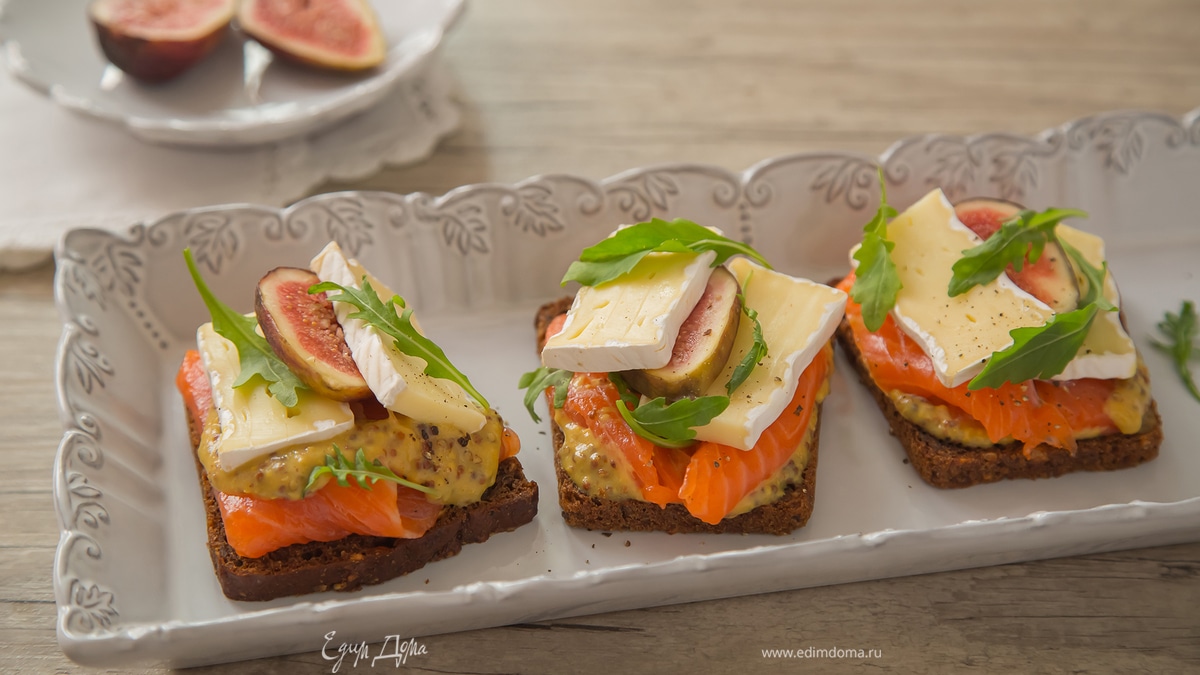 - Шаг 2Ломтики хлеба смажьте горчично-медовым соусом, выложите ломтики форели, сыра и инжира, сверху выложите несколько листьев руколы, присыпьте черным перцем.
